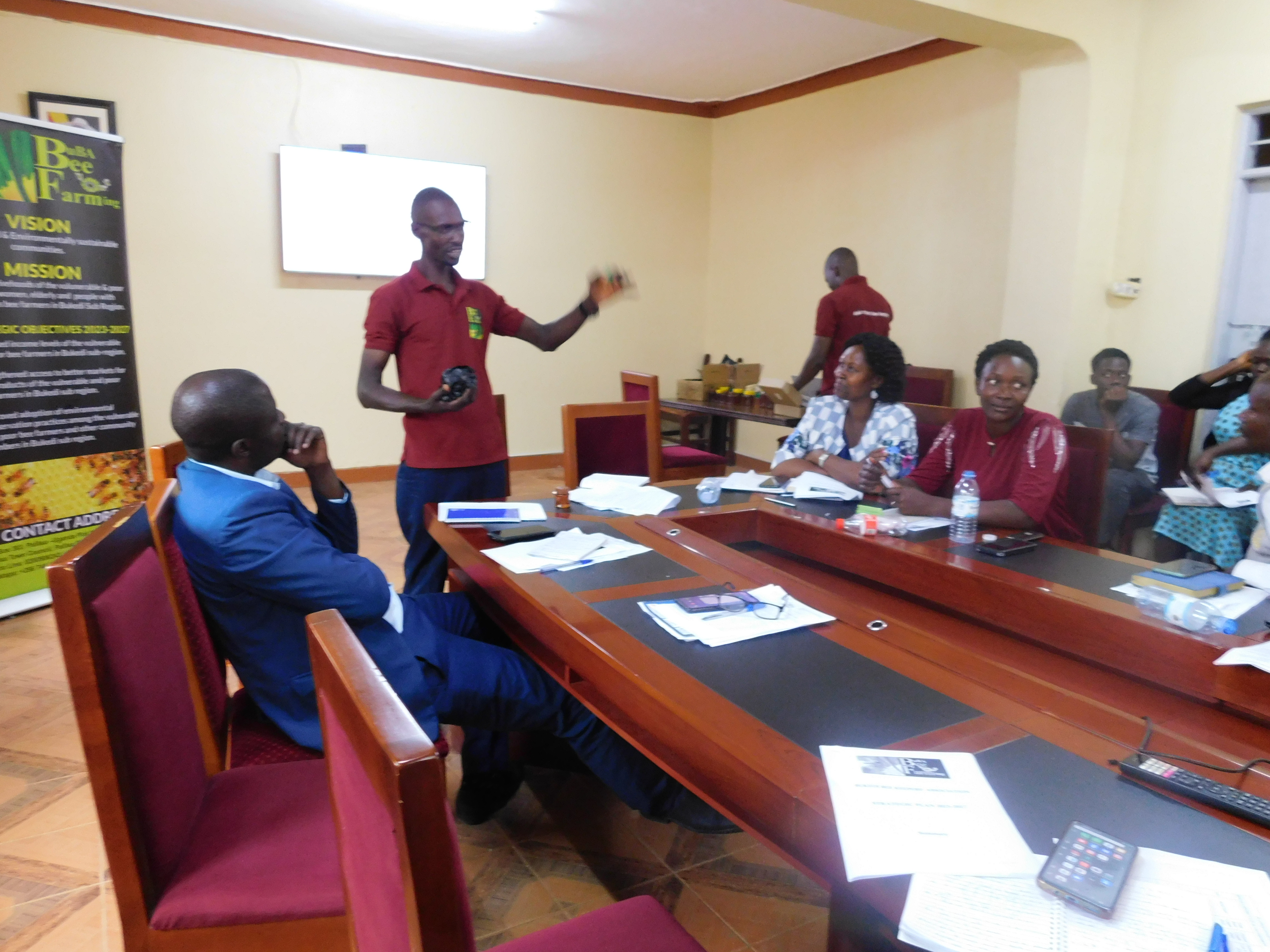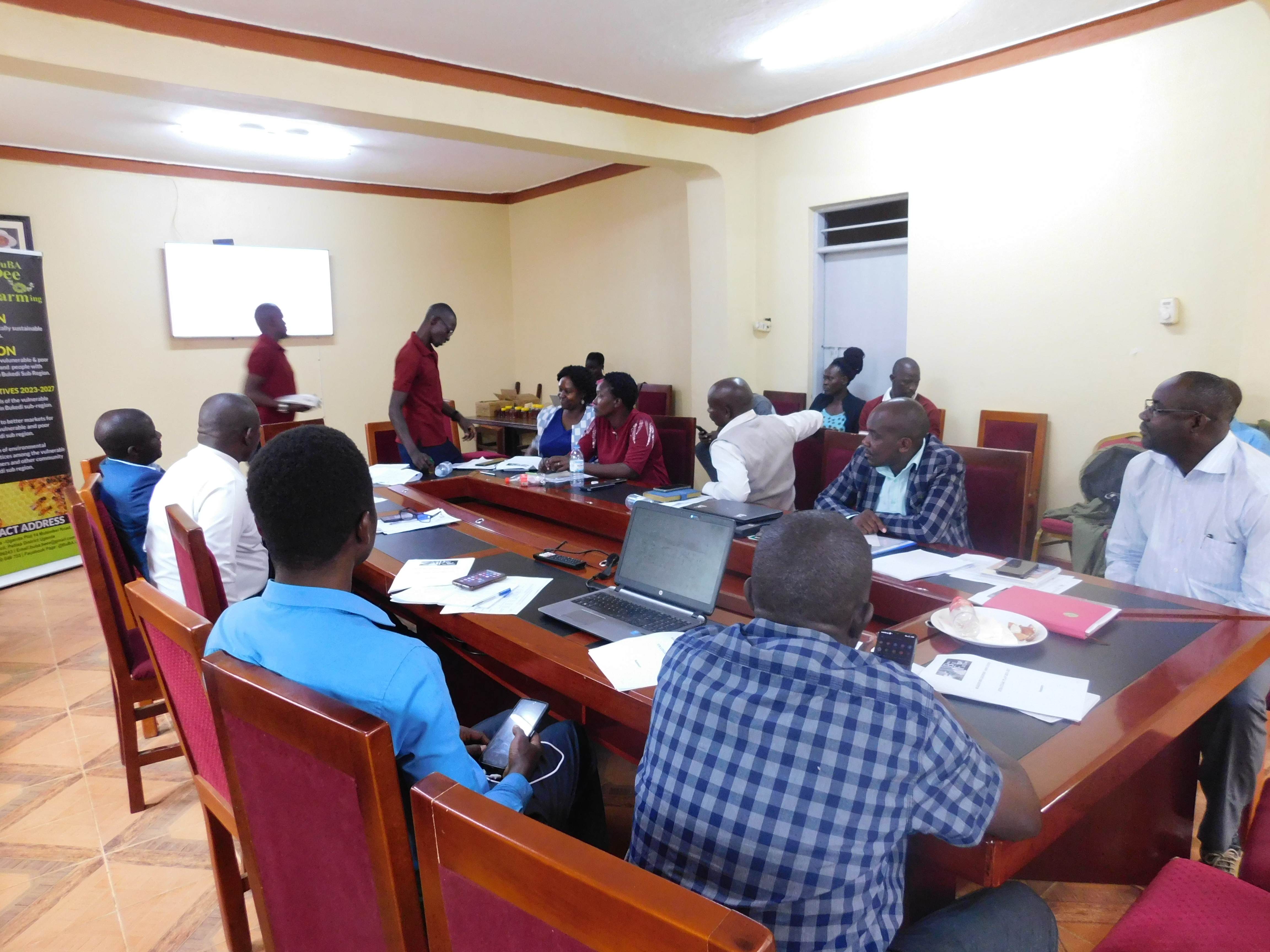 Bukedi Bee Keepers Association (BuBA) sensitizing the DEC and the District Technical Planning Committee members on their 05year strategic plan for 2023-2027 at the district boardroom today.This was intended to make the stakeholders understand what they intend to do in relation to the bee keeping project.While making his presentation, Mr. Gabengere Isaac working with BuBA, informed members that the project is aimed at increasing income levels of the vulnerable and poor bee farmers in Bukedi sub region by 2027 , strengthen to access better markets for the bee products, improve adoption of environmental conservation practices among vulnerable and poor bee farmers.He added that the bee initiative was due to the missing link between farmers, un-coordination and poor productivity.He encouraged the team to put hives around the trees at their domiciles to enable them harvest honey and venom in future even after retirement.He called upon them to take mantle in the business of bee keeping and also sensitize communities to embrace the bee project for better livelihoods in Bukedi.He emphasized that they offer a service of setting a yard for civil servants and the other roles get back to the individual with their support.“Bee products are a source of income,medicine and environment conservation,”Mr.Gabengere said.He made mention of some of the planned activities under the project that included; training farmers in apiculture as a business, provide follow-up mentoring and refresher support to targeted communities,train targeted bee keepers on value addition of bee products among others.He further explained that they have started sensitizing farmers around wetlands for environmental conservation.The District stakeholders appreciated the bee keeping project and promised their support in it’s successful implementation.BuBA is a registered NGO operating in the 04 districts of Budaka,Kibuku,Butebo and Pallisa.